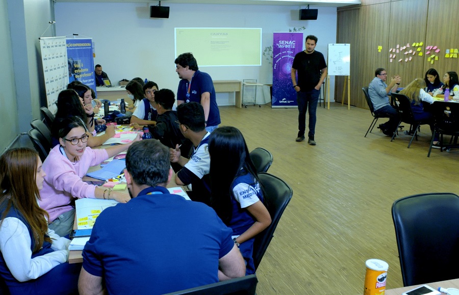 Os alunos se inscreveram em um processo seletivo e desde abril estão passando por uma capacitação semanal, conhecendo sobre o ecossistema das startups, no laboratório de inovação Senac Infinite.