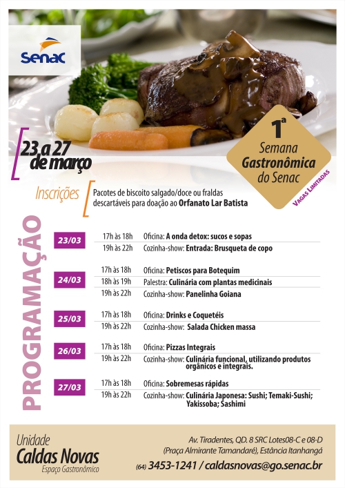 Petiscos para botequim, brusqueta de copo, culinária japonesa, panelinha goiana. Deu água na boca? De 23 a 27 de março o Senac Caldas Novas realiza a 1ª Semana Gastronômica do Senac. Durante os cinco dias de evento serão oferecidas palestras, oficinas e cozinhas-show. Para a inscrição de cada programação, o participante deverá levar pacotes de biscoito salgado/doce ou fraldas descartáveis que serão doados ao Orfanato Lar Batista. As vagas são limitadas!