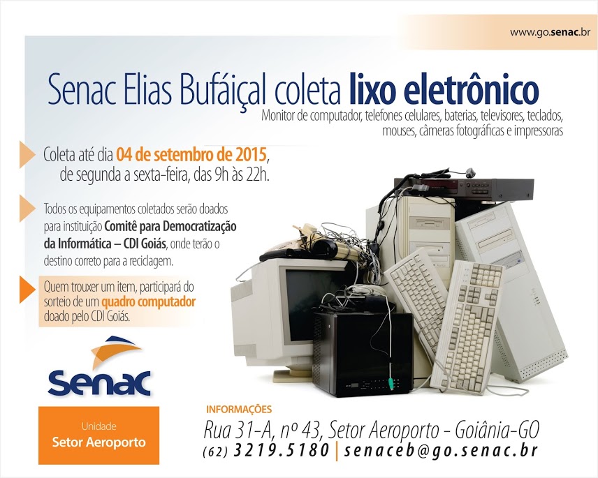 O Senac Elias Bufáiçal vai coletar, até o dia 04 de setembro materiais eletrônicos como: monitor de computador, telefones celulares, baterias, televisores, teclados, mouses, câmeras fotográficas e impressoras. Os materiais podem ser entregues de segunda a sexta-feira, das 9h às 22h, e serão doados e descartados de forma correta com o objetivo de diminuir os impactos ambientais.