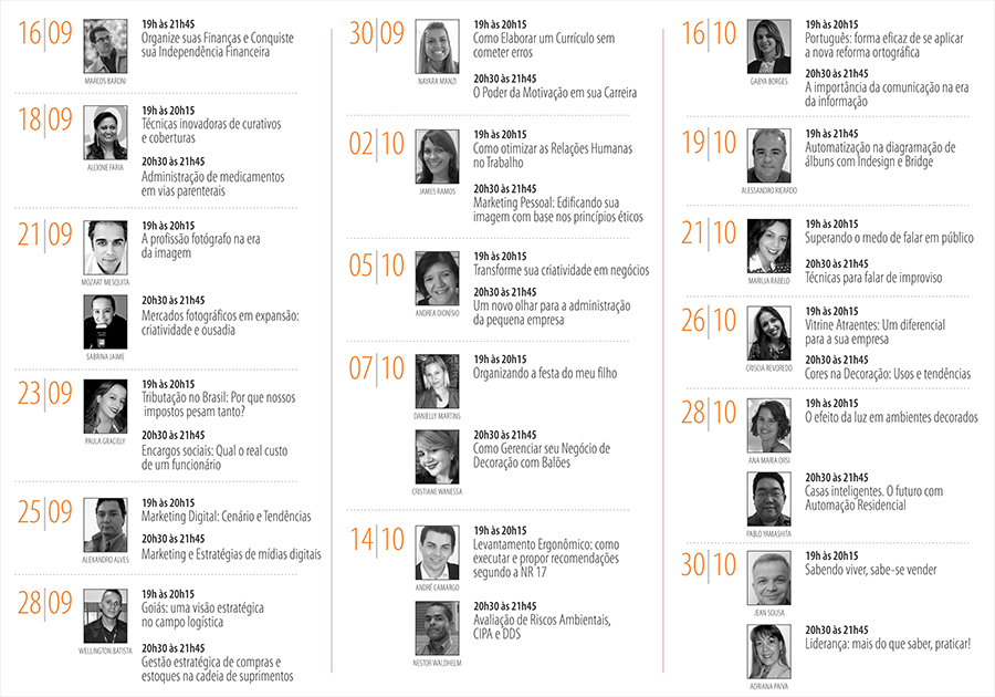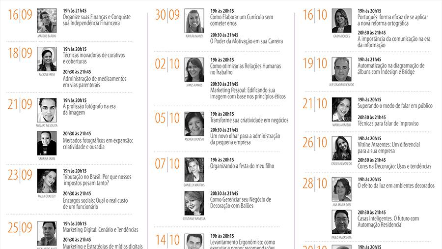 Os temas são relacionados à Gestão Financeira, Design e Fotografia, Comunicação e Marketing, Saúde e Segurança. A proposta é atender a uma necessidade do mercado de trabalho, que busca profissionais qualificados e exige constante atualização e aperfeiçoamento por parte dos trabalhadores.