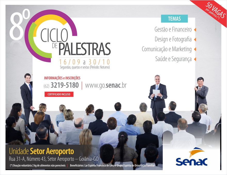 Ivana Paraizo, estagiária de Relações PúblicasDe 16 de setembro a 30 de outubro (segundas, quartas e sextas), o Senac Elias Bufáiçal realiza o 8° ciclo de Palestras, que tem como objetivo agregar informação e conhecimento sobre diversos temas relacionados ao mercado de trabalho. Serão 18 dias de evento, divididos em 34 palestras que somam mais de 60 horas.