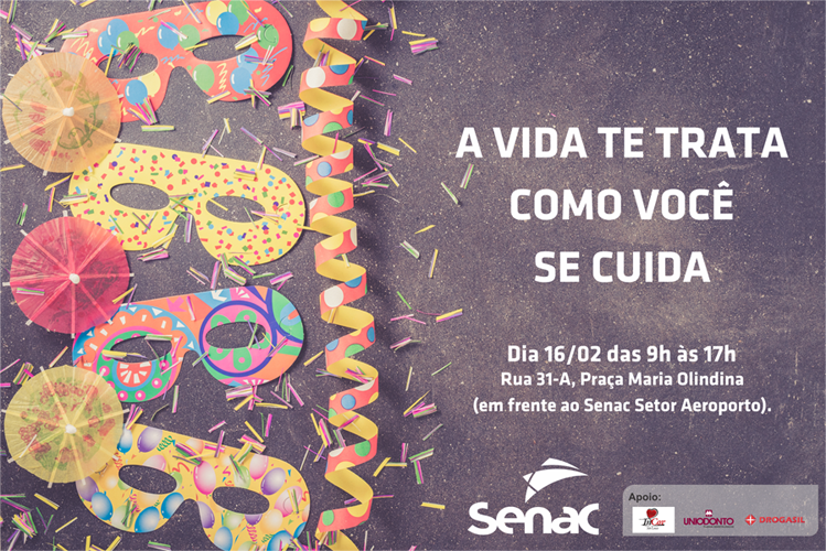 Dhieny ArêbaloFevereiro chegou, e junto com ele o tão esperado carnaval. A ansiedade pela folia é tão grande que fica fácil esquecer dos cuidados básicos com a saúde. Pensado nisso, o Senac Setor Aeroporto em parceria, com a Uniodonto, Drogasil e InCor São Lucas, realizam o “Carnaval com Saúde”. Diversos testes (HGT, PA, IMC, EPIs), eletrocardiograma, corte de cabelo e barba entre outros. O evento aconterá no dia 16 de fevereiro, das 09 às 17h, na rua 31-A, nº 43 – Setor Aeroporto - Praça Olindina (em frente ao Senac). A iniciativa busca atender aproxidamente 300 pessoas, além de alertar para os cuidados com a saúde. Os atendimentos serão por ordem de chegada e de maneira gratuita.