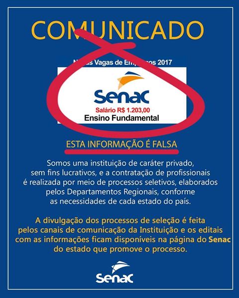 Dhieny ArêbaloNos últimos dias, fanpages que anunciam "vagas de emprego" tem usado a marca do Senac indevidamente. As informações não procedem. Sempre que ver algum tipo de anúncio, confira se a fonte é confiável e tenha cuidado ao expor informações pessoais, como telefone para contato. Mesmo que a publicação pareça segura, procure SEMPRE os canais oficiais do Senac para sanar suas dúvidas. Quaisquer vagas serão divulgadas apenas em nossas mídias sociais e site.