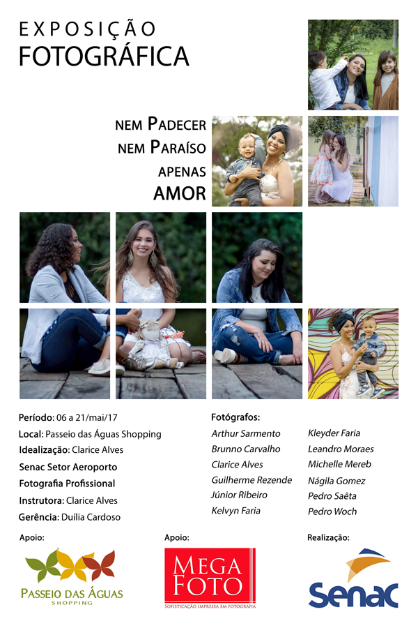 Dhieny ArêbaloA Exposição Fotográfica "nem Padecer, nem Paraíso, apenas AMOR" idealizada por Clarice Alves, instrutora do curso de Fotografia Profissional do Senac Setor Aeroporto, traz a mostra fotográfica de 39 fotos realizadas por onze alunos e pela instrutora, em que pode ser conferida no shopping Passeio das Águas de 06 a 21 de maio, no horário de funcionamento do shopping.