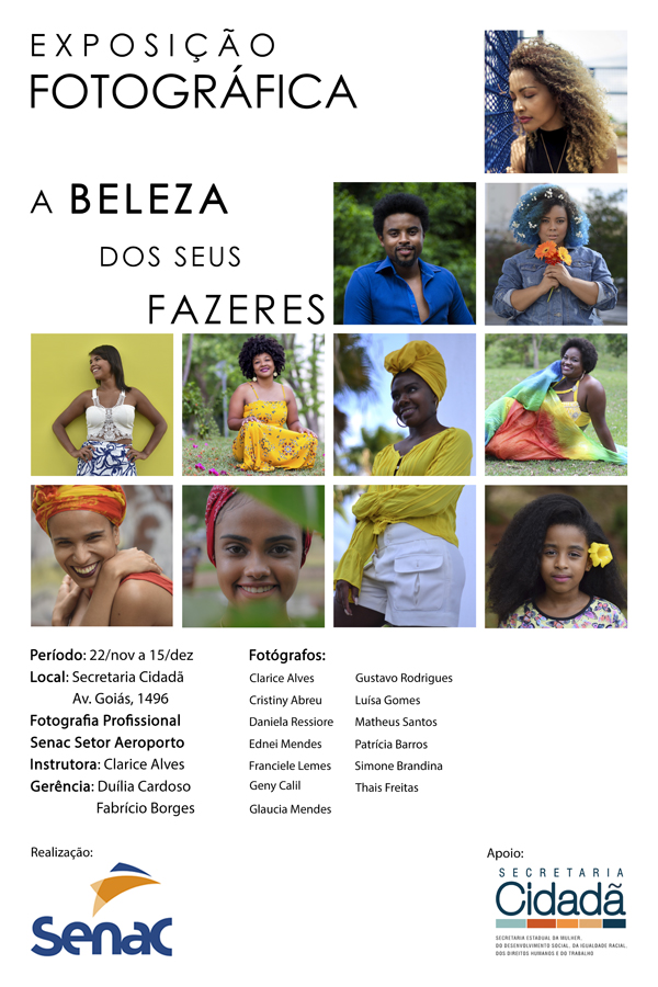 Em 22 de novembro, o Senac Setor Aeroporto realizou exposição fotográfica durante a solenidade de entrega da comenda Zumbi dos Palmares, no Palácio das Esmeraldas. Com o tema "A beleza dos seus fazeres", a mostra acontecerá também na Secretaria Cidadã até o dia 15 de dezembro e na Vila Cultural de 26 de novembro a 01 de dezembro. Estiveram presentes na exposição, a Diretora Regional do Senac, Felicidade Melo, a Diretora de Educação Profissional, Maria de Lourdes Narciso, a Gerente do Senac Setor Aeroporto, Duília Cardoso, o Supervisor de Informática, Kleyder Faria e a instrutora de Fotografia Profissional, Clarice Alves, juntamente com os alunos do curso, autores das fotos expostas.