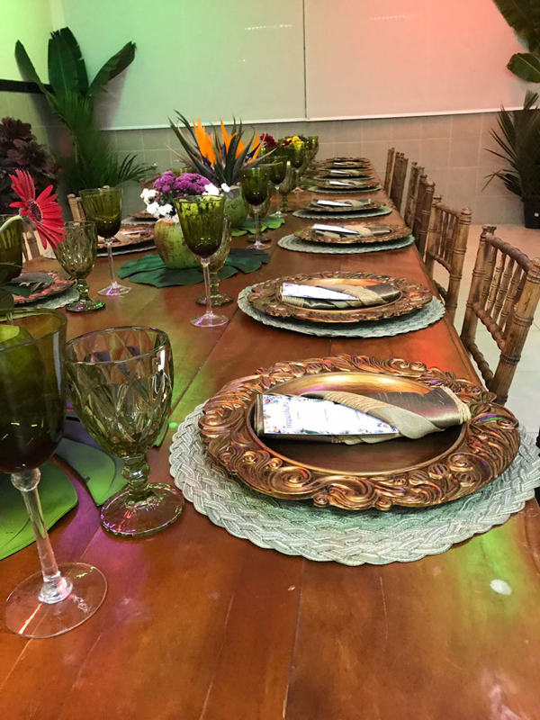 Lidiane Maia - estagiária de Relações PúblicasA turma do curso de Cozinheiro do Senac de Aparecida de Goiânia, orientados pelo instrutor e chef Gustavo Álvares, realizou jantar temático em desenvolvimento do projeto integrador. Com a proposta de criar pratos genuinamente brasileiros, fugindo do clássico, a partir da combinação de diversos sabores, os alunos ofereceram aos convidados um cardápio original e elaborado, baseado em preparos cujos ingredientes tipicamente tropicais resultassem em sabores enraizados na cultura brasileira. Para tornar o evento ainda mais marcante, todo o ambiente foi decorado com a temática Tropicalista.