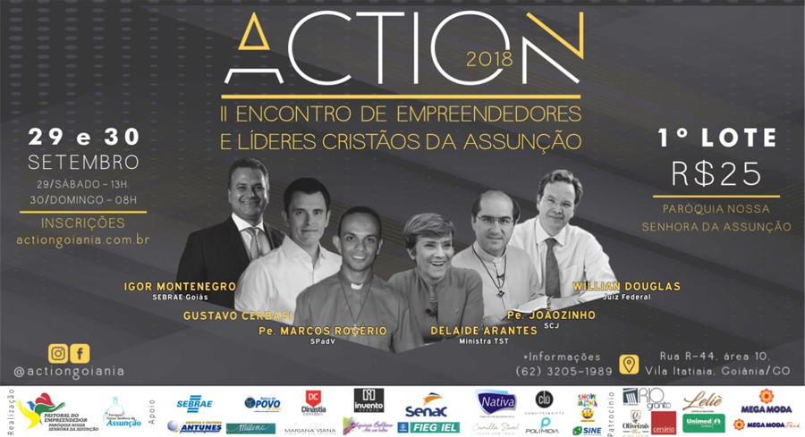 Colaboração Assessoria de Imprensa AssunçãoA segunda edição do ACTION 2018 acontece nos dias 29 e 30 de setembro (sábado e domingo), na Paróquia Nossa Senhora da Assunção, com a parceria do Senac Goiás e a participação do Padre Marcos Rogério além de contar com renomados palestrantes como Gustavo Cerbasi (consultor financeiro), Pe. Joãozinho, William Douglas (juiz federal), Delaide Arantes (Ministra do TST) e Igor Montenegro (SEBRAE Goiás), além dos CEOs Chris Taveira e Leonardo Oliveira. As inscrições do primeiro lote, no valor de R$ 25,00, podem ser realizadas pelo site actiongoiania.com.br ou na secretaria paroquial.