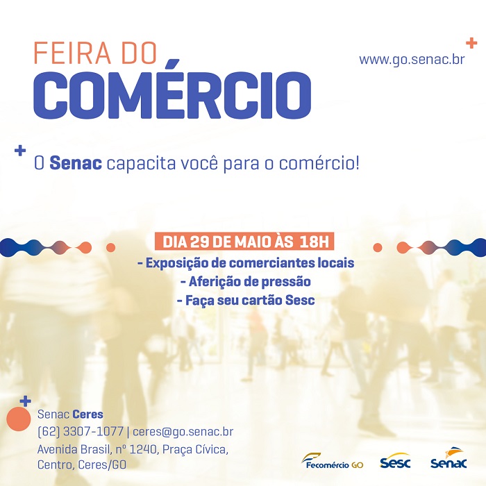 Tiele Miranda - Estagiária de Relações PúblicasNo dia 29 de maio, às 18h, o Senac Ceres realiza a Feira do Comércio para conectar a comunidade com as melhores empresas da região. É a sua oportunidade de visitar estandes e conhecer os produtos das empresas participantes. Além disso, o público terá a oportunidade de aferir pressão e ainda fazer o cartão Sesc.