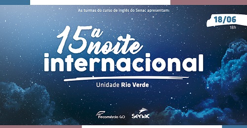 Francyelle Nunes - Estagiária de jornalismoO Senac Rio Verde convida toda a comunidade a prestigiar a 15° Noite Internacional, que será realizada na próxima terça-feira (18), a partir das 18h. A unidade está localizada na Rua Ilídio Leão nº 154, no Setor Vitória Régia. Para se inscrever basta realizar a doação de 1kg de alimento não perecível (exceto sal e fubá).