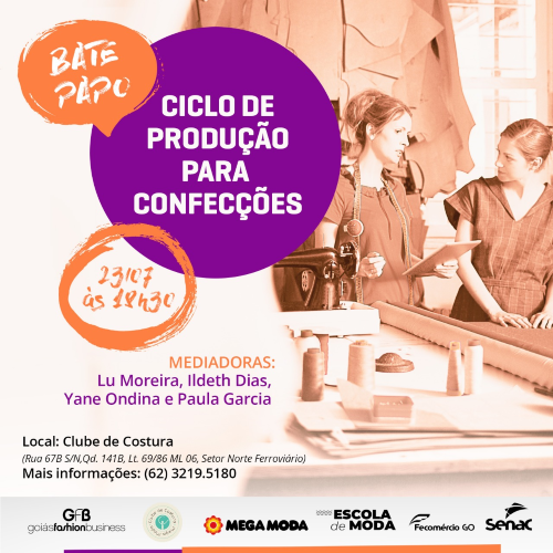 Maria Augusta do Planalto - Estagiária de JornalismoNesta terça-feira, dia 23, o Clube da Costura, em Goiânia, recebe um bate papo sobre ciclo de produção para confecções. A roda de conversa será às 18h30 com a entrada gratuita. Essa atividade faz parte de uma parceria realizada pelo Senac Goiás e o Clube de Costura. O bate papo sobre ciclo de produção para confecções será mediado por quatro profissionais reconhecidas da área, Yane Ondina, Lu Moreira, Paula Garcia e Ildete Dias. Todos podem participar da atividade. Mais atividades ainda estão previstas para ocorrerem no decorrer dos próximos meses.