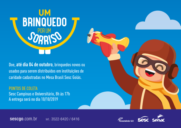 Senac GoiásO Sesc Goiás lançou no dia 19 de setembro a campanha “Um brinquedo por um sorriso”. As coletas estão sendo realizadas em todas as unidades do Sesc e do Senac em Goiás, de segunda à sexta-feira, das 8h às 17h, e no sábado, das 7h às 13h. As doações de brinquedos novos e usados (em boas condições) serão destinadas às crianças em situação de vulnerabilidade social atendidas por instituições beneficiadas pelo Programa Mesa Brasil Sesc. As doações poderão ser feitas até o dia 4 de outubro.
