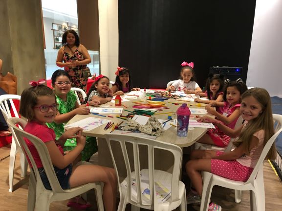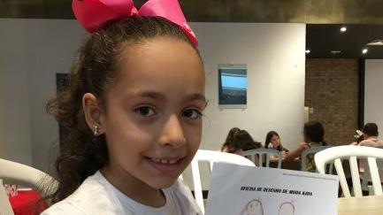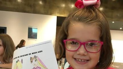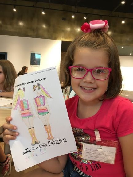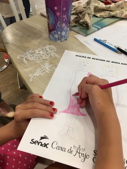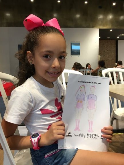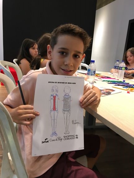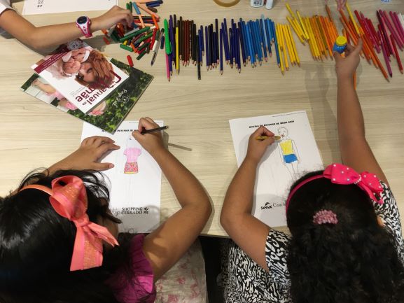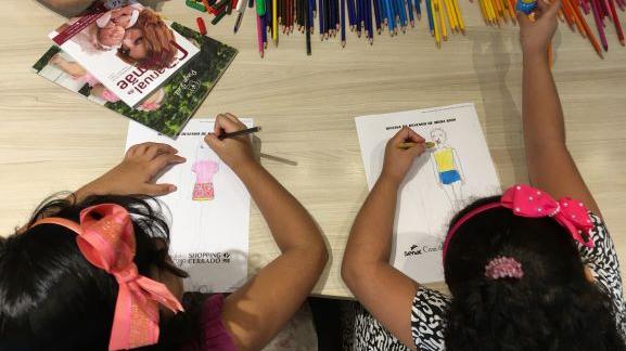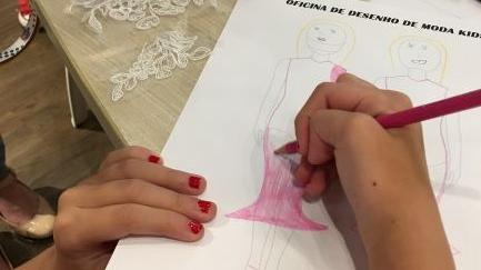 gratuita de desenho de moda infantil. A atividade ocorreu no Shopping Cerrado,
