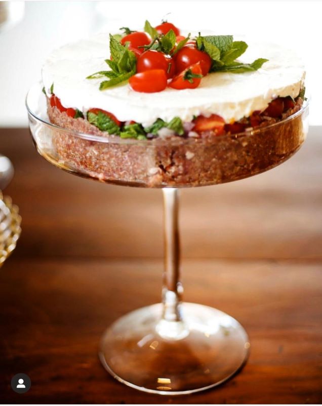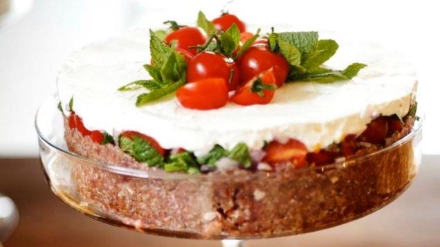 - Montagem; em um aro colocar o trigo no fundo e pressionar com as mãos, coloque o vinagrete e em seguida com uma colher coloque a coalhada seca, decote com tomates e hortelã.