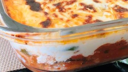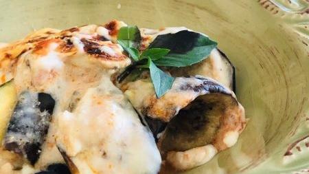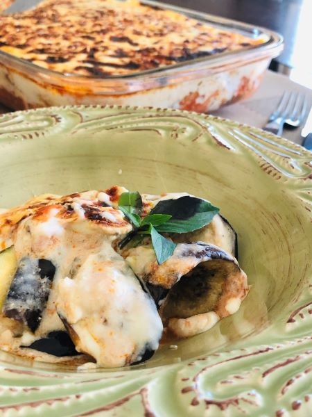 - Para finalizar a lasanha, faça mais uma camada de berinjela e abobrinha, regue com o restante do molho de tomate, por último coloca fatias de queijo branco e mussarela, 2 xícaras de molho bechamel e salpique 100 gramas de parmesão ralado por cima.