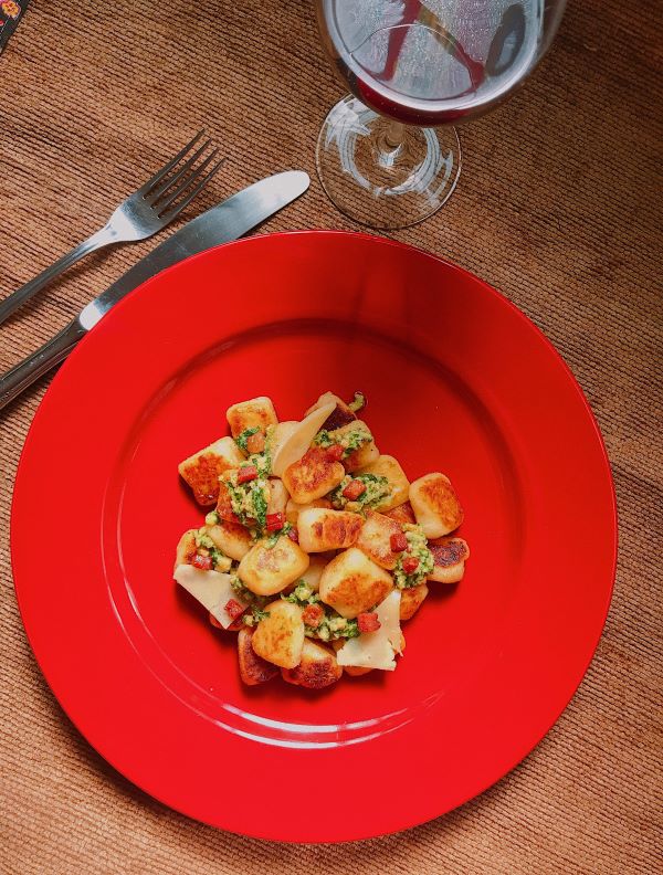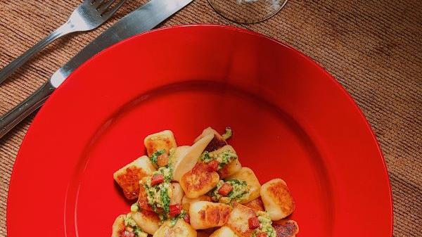 - Nos pratos, coloque os nhoques selados, regue um pouco do pesto, encaixe as lascas de parmesão e salpique com os cubos de bacon crocantes. Caso opte uma versão vegetariana, você pode substituir o bacon por cogumelos refogados.