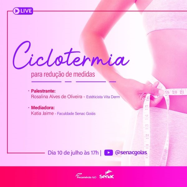 Senac GoiásA coordenação do curso de Estética e Cosmética da Faculdade Senac convidou a esteticista e técnica da Vita Derm, Rosalina Alves de Oliveira, para participar de uma live, no dia 10 de julho, às 17h, no canal do Youtube do Senac Goiás, com o tema: ciclotermia para redução de medidas. O ao vivo será mediado pela coordenadora do curso, Katia Jaime.