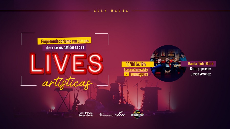 Senac GoiásA volta às aulas da Faculdade Senac neste segundo semestre vai ser um show a parte. Para receber os alunos veteranos para o semestre letivo que segue online por tempo indeterminado, a aula magna será no formato de live, com o tema “Empreendedorismo em tempos de crise: os bastidores das lives artísticas”. Na ocasião haverá um bate-papo entre o cantor e baterista Jason Veronez e os demais integrantes da banda Clube Retrô (que apresentou na primeira edição de Drive In em Goiânia).