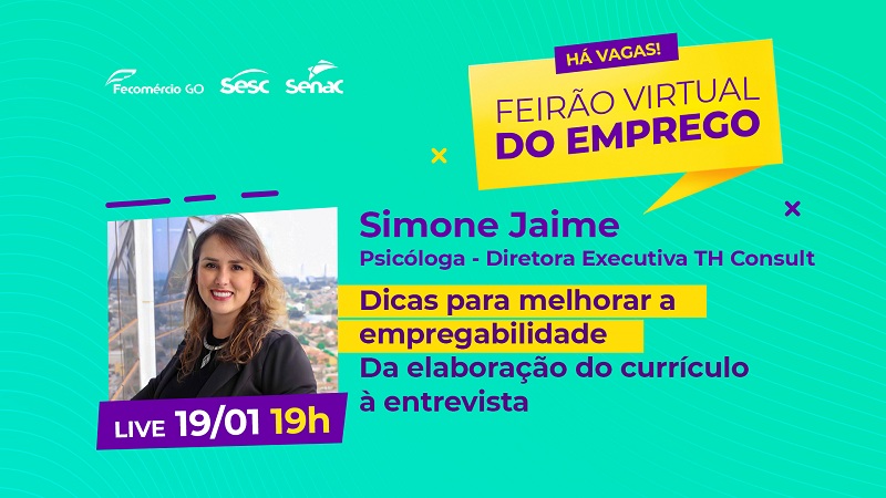 Senac GoiásQuem nunca teve dúvidas na hora de estruturar um currículo ou não se sentiu nervoso e ansioso antes de uma entrevista de emprego? Podem parecer coisas bobas, mas são mais comuns que se imagina. “As duas coisas acontecem o tempo todo”, explica a psicóloga especialista em Gestão de Pessoas, Simone Bonfim Jaime, que estará ao vivo no canal do Senac Goiás (youtube.com/ senacgoias) nesta terça-feira (19), às 19h, para conduzir a live “Dicas para melhorar a empregabilidade - da elaboração do currículo à entrevista”. O evento marca a abertura da 1ª edição virtual do Feirão de Empregos realizado pelo Sistema Fecomércio, Sesc-Senac, que acontece entre 19 e 22 de janeiro.