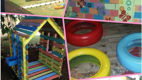 Os alunos, com a supervisão do instrutor do Senac, Gláucio Bianchetti do Amaral, realizaram a reforma da área externa do local com materiais reciclados, como pneus.